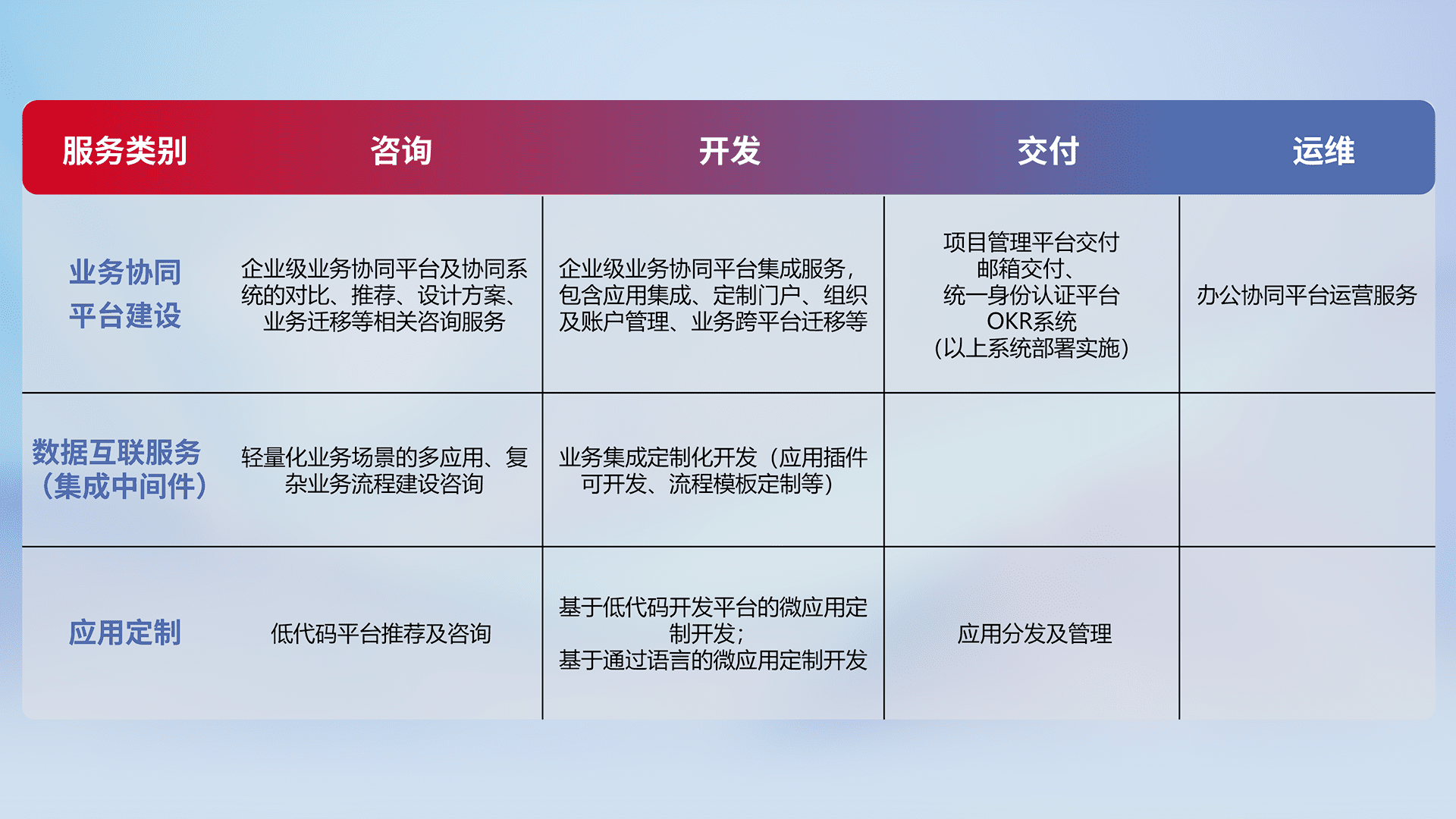 针对钉钉、、、企微、、IDaas等平台级产品提供产品的规划、、方案、、交付、、、定制化开发等服务,,实现如统一协同办公、、、智能客户服务、、、混合会议管理、、、、智能数据查询、、、等业务场景,,,实现数字化转型。。。。