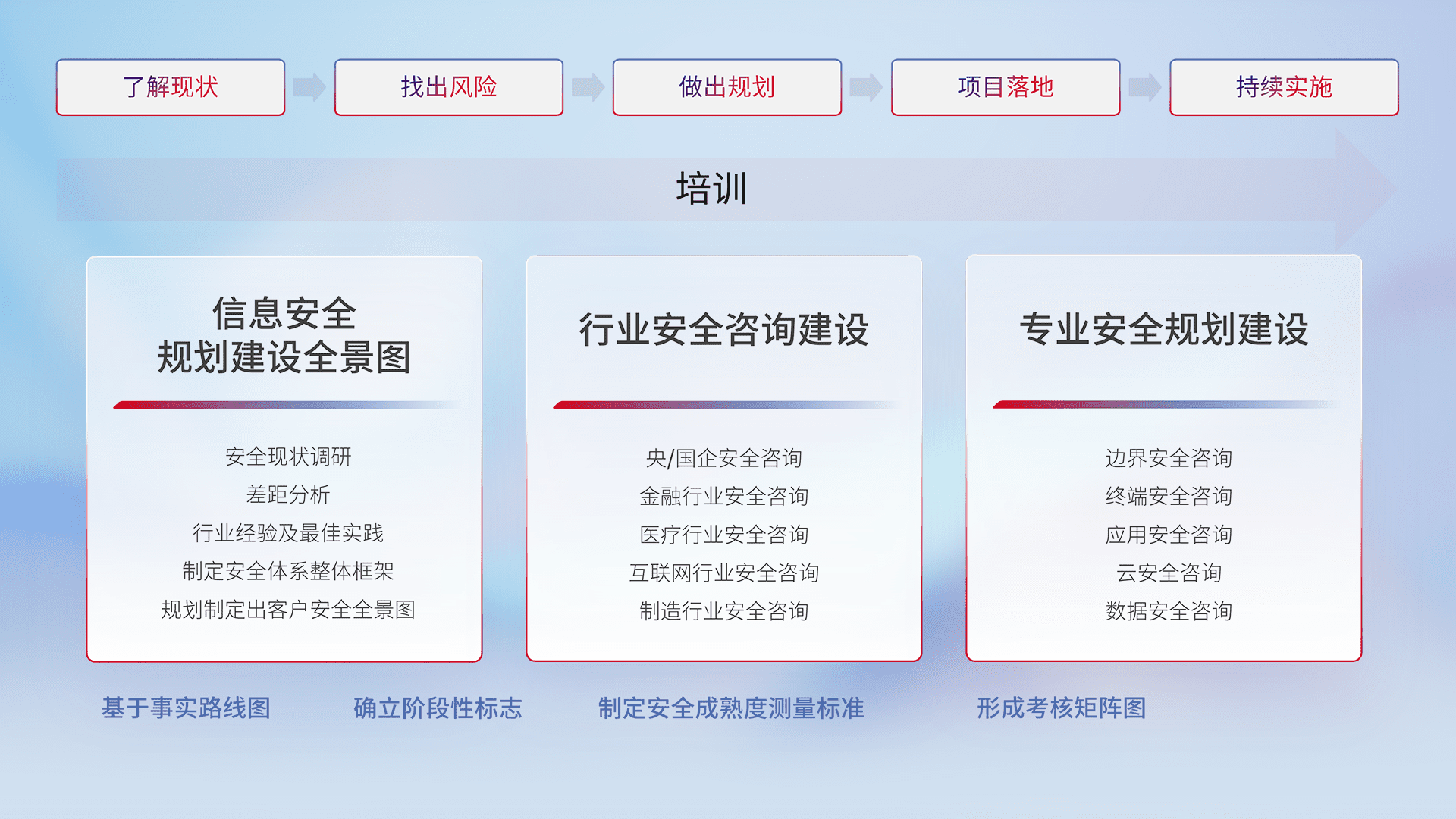 针对客户行业特性,,以专业的安全服务+多厂商联合解决方案提供专属的一站式安全管理服务,,帮助客户全面感知网络空间威胁,,,,基于识别、、、检测、、、分析、、防护、、监测、、、响应的服务理论模型,,从方案咨询、、、、集成交付、、、评估验证、、优化加固、、、运维运营,,,,致力于为客户提供完整的闭环管理式安全服务。。。。以实战经验为客户打造高抵御风险的安全体系,,,帮助客户发现威胁、、对抗威胁、、、、处置威胁,,,,不断积累安全对抗能力,,,,持续保障数字化安全。。。